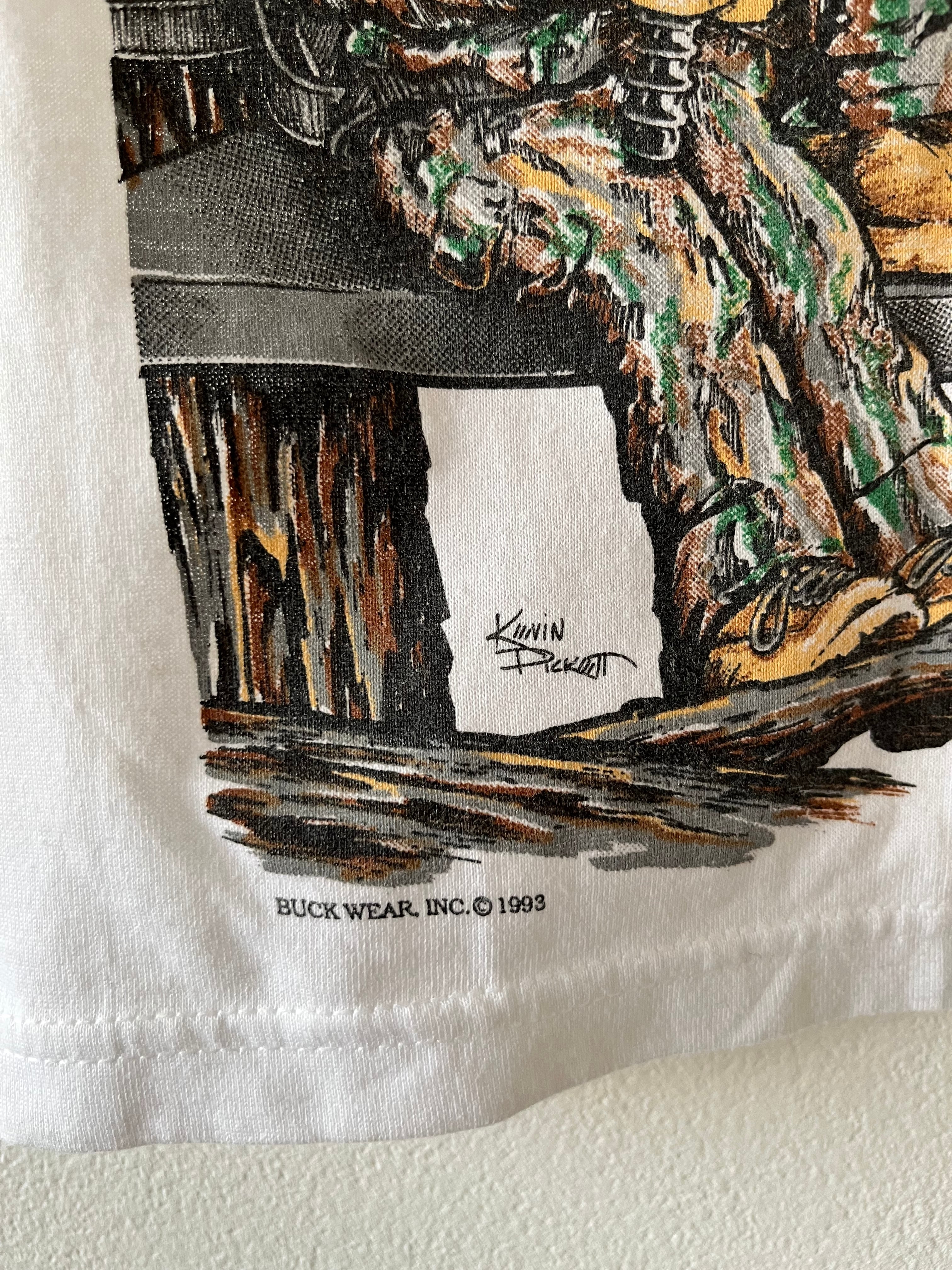なんともいかしたプリントデザイン。最近トレンドとして言われているリアルツリー柄をベースに、キッズハンターが腰かけている大人顔負けのヴィンテージピース。